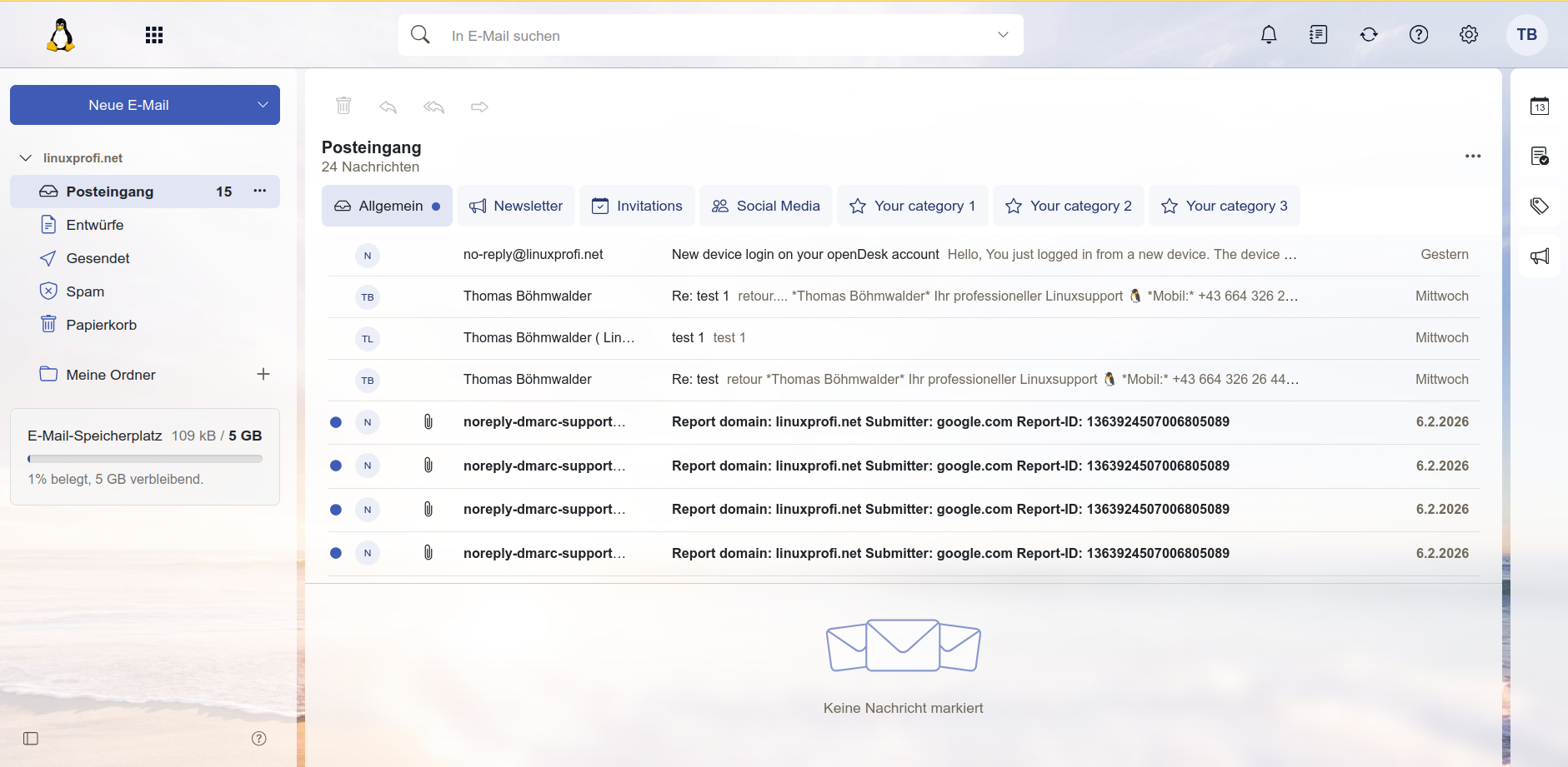 Diese Integration deckt Themenseitig eigentlich am meisten ab. Ungewohnt hübsch (für mich) präsentiert sich ein unkomplizierter WebMail-Client der keine Wünsche offen lässt. Ich gebe zu – ich komme eher von der MailCow-Ecke. So zu lesen ist, lag dem Entschluß für Open-XChange die einfachere Installierbarkeit mit Kubernetes zugrunde. So nebenbei werden Kalender / Kontakte / Aufgaben von Open-XChange beigestellt. Zur einfacheren Handhabbarkeit wurden diese im Portal herausgestellt um nicht immer erst in den Mailteil gehen zu müssen um einen Termin einzutragen. Top….